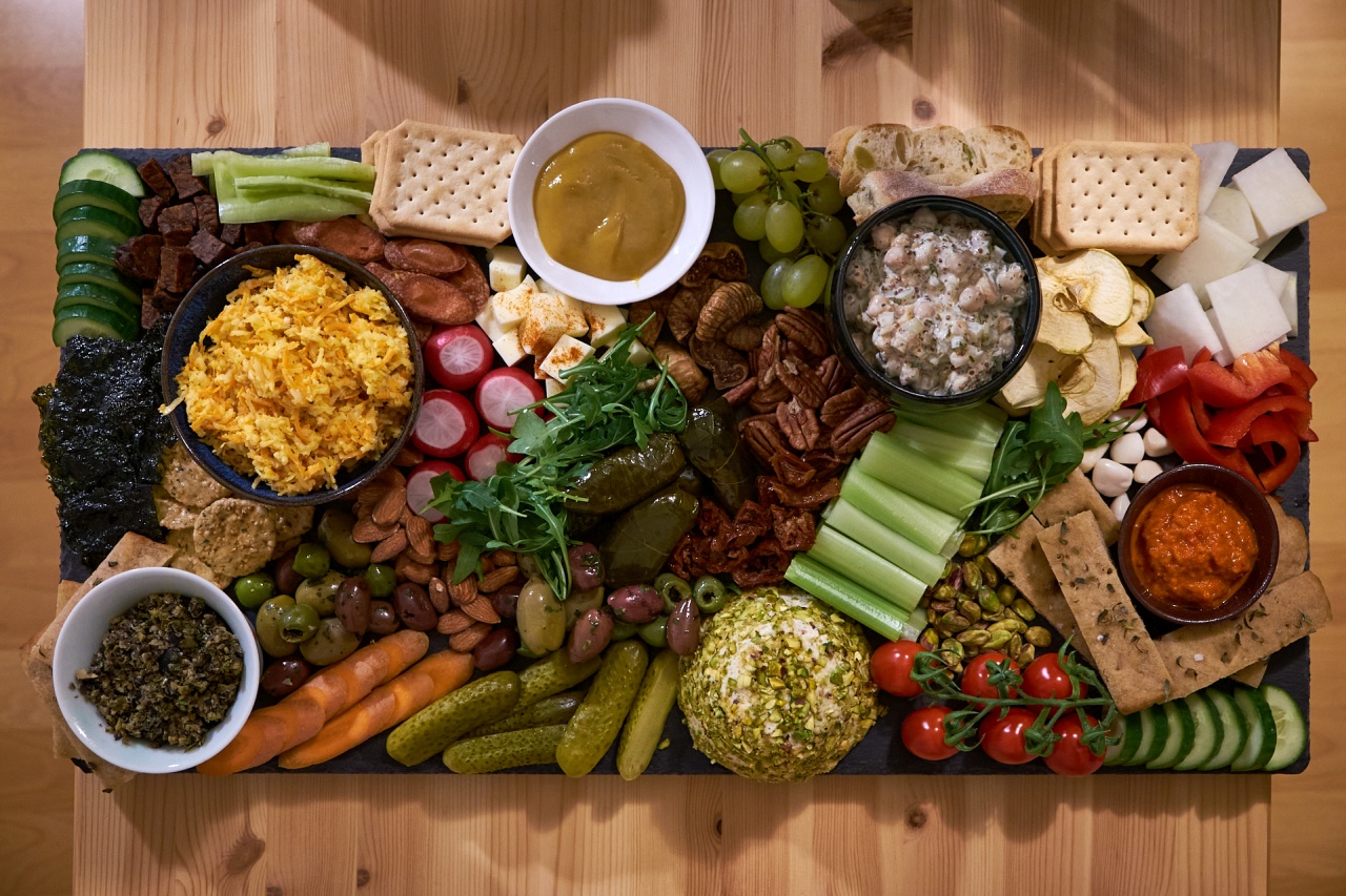Start by placing empty dip bowls on the board, then add the other ingredients using the bowls as “kernels” for the arrangement. Assemble the ingredients in the category order listed above. You can also place ingredients along the board edges. The goal is to have several clusters of snacks that you'll gradually grow outwards until the board is filled. Play with different arrangements for variety - ingredients can be placed in carefully arranged rectangles, long straight rows, curved rows or randomly shaped heaps. Try to make arrange the ingredients so that they're closely packed and the board underneath is barely visible. To finish the board, place the crackers and baked goods, cover any inconvenient voids with pinches of greens and fill the dip bowls.